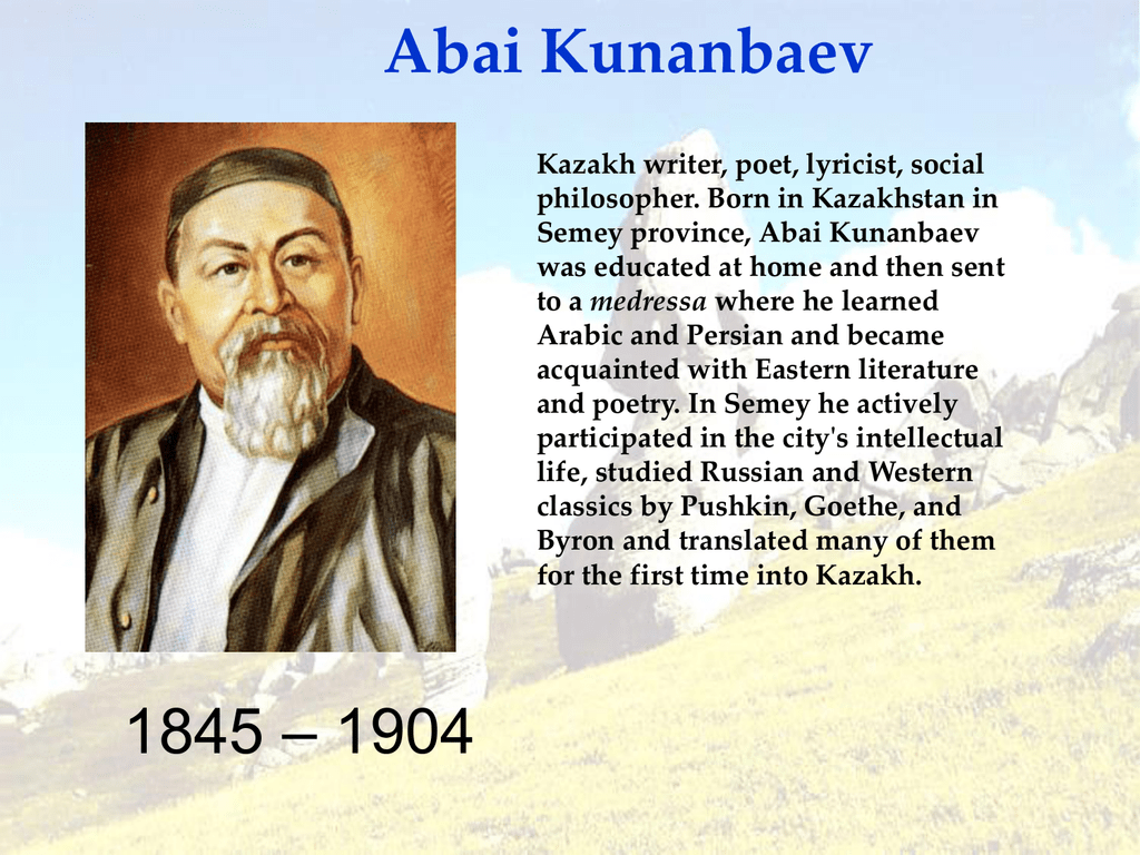 Abay Kunanbaev (1845-1904). Abay was born in 1845 at the bottom of the Chingiz Mountain in the today's Abai district (former Karkaraly) located in Eastern Kazakhstan region (formerly, the Semipalatinsk region). |