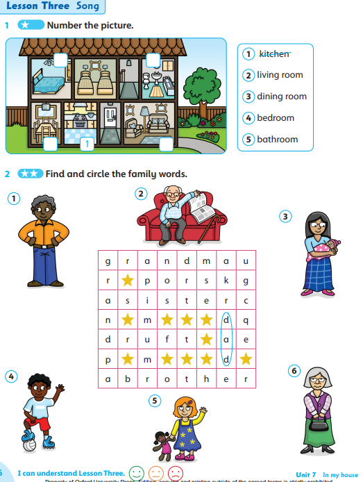 Briefly ask students what they learned today (greetings, family members, rooms of the house, introducing themselves). Home task: Workbook page 56, exercise 1 and 2. |