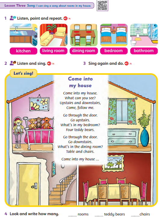 Students tell children to count the teddy bears and the chairs and write the numbers. Answer 4 rooms 4 teddy bears 6 chairs |