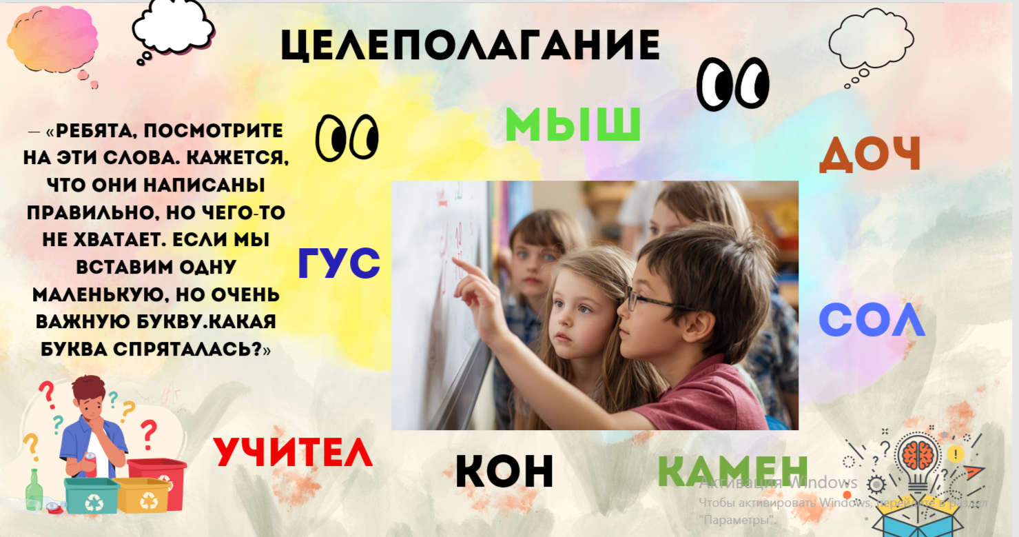 Целеполагание Ученики внимательно смотрят на слова, которые учитель вывесил на доске. По очереди они обсуждают и пытаются догадаться, какая буква может отсутствовать в этих словах Вместе формулируют предположение о том, что объединяет все слова на доске.