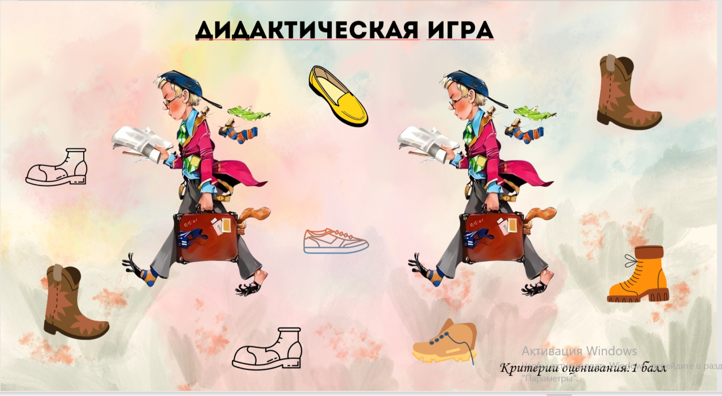 Слова учителя: Ребята, сейчас мы будем играть в дидактическую игру. (Учитель на доске при помощи иллюстрации прикрепляет рассеянного башмачка и разбросанную обувь.) На доске две картинки — башмачки, один с мягким знаком, другой без. Представьте, что рассеянный башмачок оставил свою обувь, и ваша задача — подобрать слова, которые спрятались в этих башмачках. Вы берёте слово и решаете, в какой столбик его поставить: с мягким знаком или без мягкого знака. Везде разбросаны башмачки с разными словами, поэтому нужно внимательно смотреть на слово и правильно выбрать столбик. Таким образом, мы закрепляем правила написания мягкого знака в игровой форме. Физминутка: