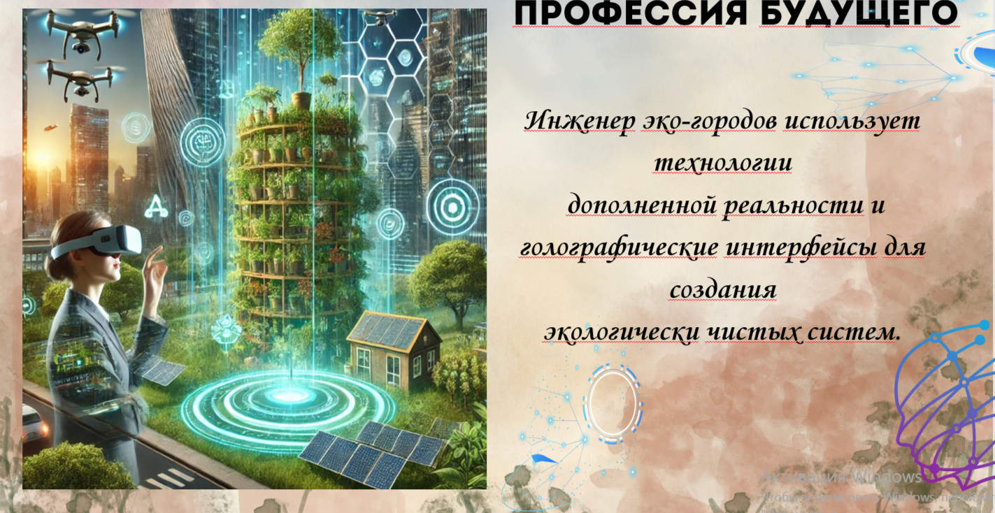 Сейчас, ребята, мы попадём в профессию будущего — инженера эко-городов. На экране появится слайд с изображением современной зелёной инфраструктуры и технологий будущего Дидактическая игра: