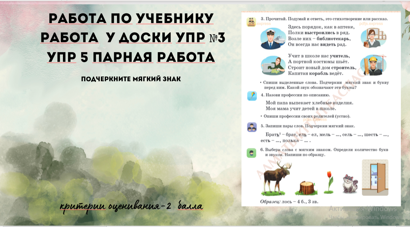Сначала ученики смотрят на экран и слушают персонажа, который озвучивает текст на доске. Они внимательно воспринимают услышанное и определяют, что перед ними — стихотворение или рассказ. Затем дети садятся за парты и выполняют парную работу: записывают несколько слов, подчёркивая мягкий знак. Ученики внимательно смотрят на слайд и слушают рассказ о профессии будущего — инженера эко-городов. Они мысленно погружаются в эту профессию.