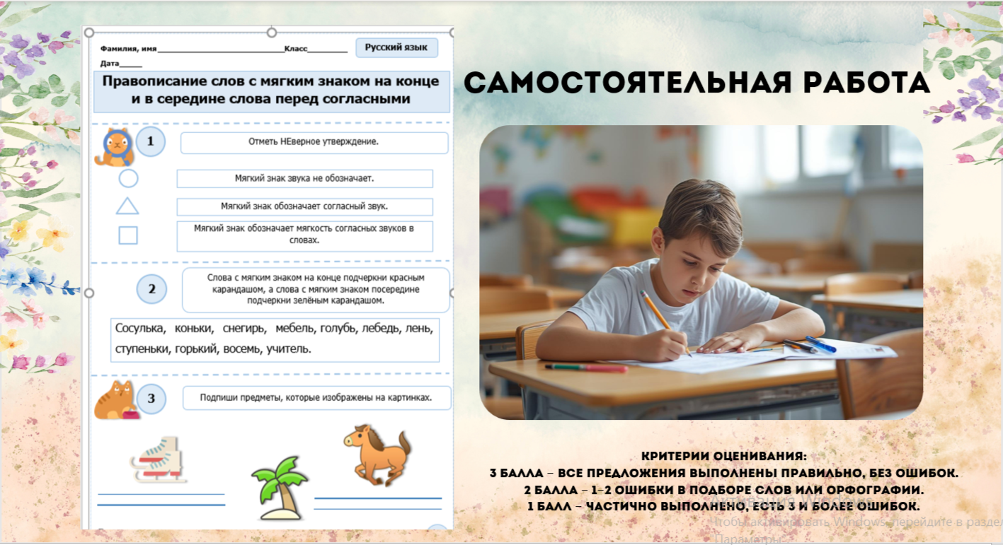 «Ребята! Сегодня на уроке мы будем выполнять работу по учебнику «Отгадай загадку».» Устная работа с загадкой: Учитель: «Сначала прочитаем загадку вслух. Попробуйте отгадать её.» (Дети читают загадку, отгадывают её.) Раздаю ученикам рефлексию. «Молодцы! Запишите своё имя и распишитесь, что вы сделали задание.» Комментарий: Обращаю внимание на устную работу, учу детей слушать и думать над загадкой. Объяснение новой темы (мягкий знак): Учитель: «Теперь давайте вспомним, какую роль выполняет мягкий знак в словах. Мягкий знак в середине слова делает согласный мягким. В конце слова он также смягчает согласный и иногда показывает окончание слова. Например, в слове «мель» мягкий знак делает звук «л» мягким. В слове «конь» мягкий знак стоит на конце и смягчает согласный «н». Мягкий знак не обозначает отдельный звук, а влияет на произношение согласных.» Запись слов парами: Учитель: «Следующее задание — записать слова парами. Подчеркните букву, которая показывает мягкость согласного.» (Дети выполняют задание.) Учитель: «Отлично! Посмотрите, как мягкий знак меняет звучание слов. Например, «пень» — мягкий знак на конце, а «соль» — в середине. Старайтесь замечать разницу в произношении.» Работа по учебнику