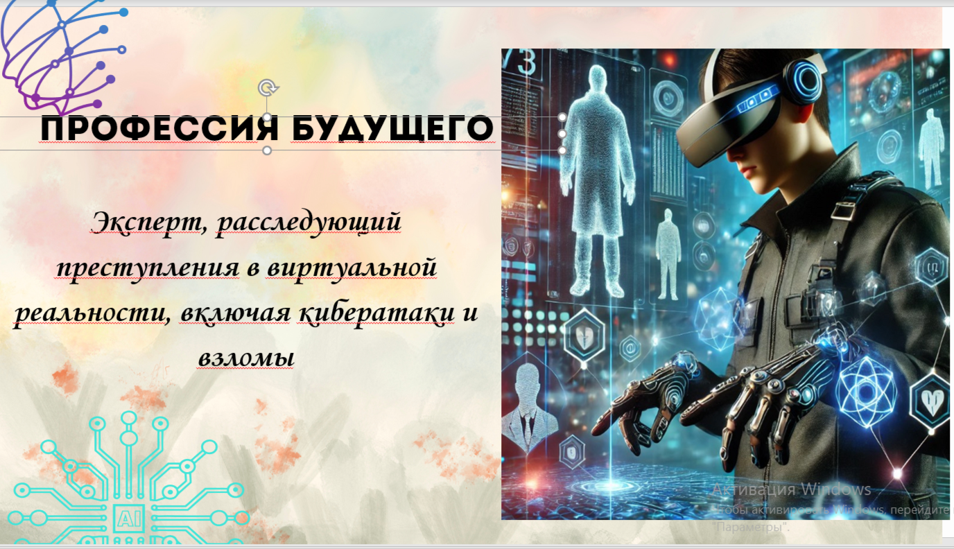 Ребята, а сейчас мы погрузимся в профессию будущего — эксперта, расследующего преступления в виртуальной реальности. На слайде вы увидите картинку, которая показывает, как работает такой специалист. Вы представите себя кибердетективами и попробуете применять навыки расследования на практике. Интерактивная игра. Закрепление темы: