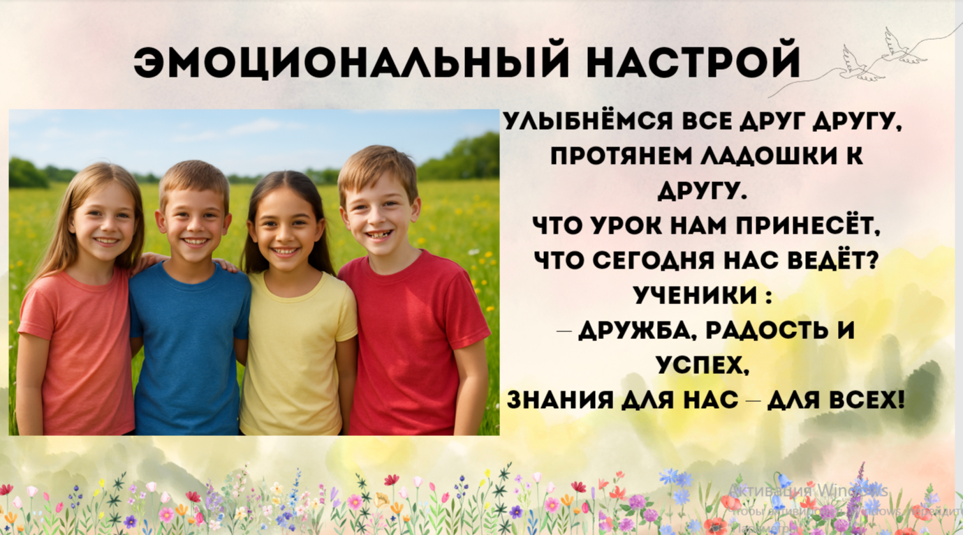 Создание положительного эмоционального настроя: Улыбнёмся все друг другу, Протянем ладошки к другу. Что урок нам принесёт, Что сегодня нас ведёт? Ученики: — Дружба, радость и успех, Знания для нас — для всех!