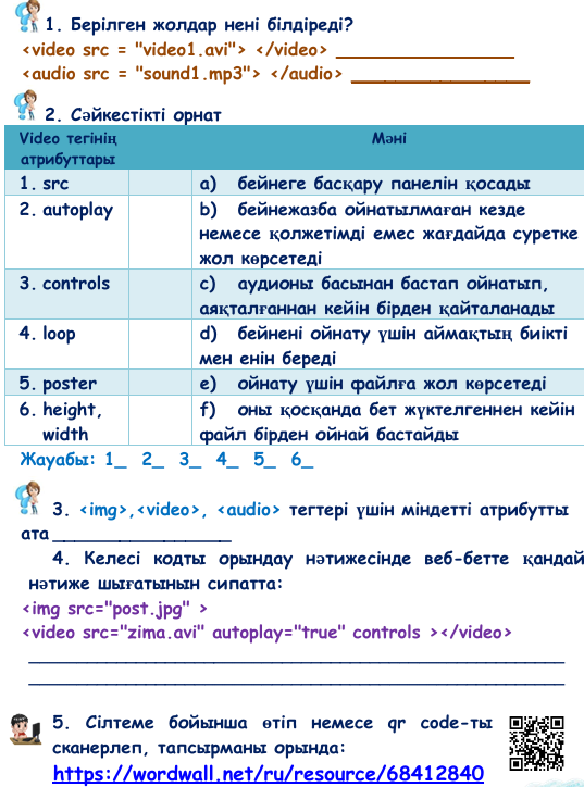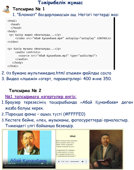 Жаңа тақырыпты меңгеру Оқулықпен жұмыс. Мұғалім оқушыларды жаңа ақпаратпен таныстырады, бірге талқылайды (бейнежазба, презентация, флипчарт қолдануға болады). Тапсырма: Веб-бетке мультимедиа орналастыру тегтерін салыстырып, талдап, кестеге толтырыңдар