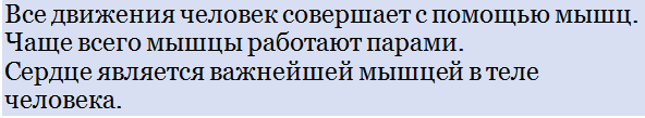 (К) Физминутка Нет, не ветер, чудо-ветер, И не лес шумит вокруг, Это просто переменка Для уставших наших рук. Каждый пальчик поплясал И с себя усталость снял. На моей руке пять пальцев, Пять щипальцев, Пять хватальцев. Чтобы брать и чтоб дарить, Чтоб строгать и чтоб пилить, Чтобы их же сосчитать: 1, 2, 3, 4, 5. (К) Работа в коллективе. Прочитай. Мышцы - это органы тела человека, состоящие из эластичной мышечной ткани. Мышцы тянутся вдоль костей. Они крепятся к костям и способны сокращаться. Каждое движение человека (от бега и прыжков до вздоха и улыбки) совершается с помощью мышц.