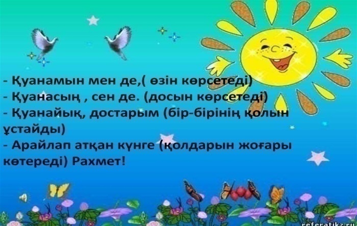 Жарайсыңдар! Дискриптор: Өлеңді хормен айтады және бір-біріне тілектер айтады.-1б |