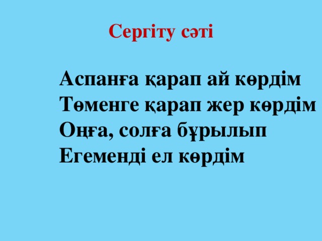 Жаңа тақырыпты меңгереді. Сабаққа қатысып,сұрақтарға жауап береді. Отан туралы өз пікірлерін айтады. Сергіту сәті Егемен Қазақстан Республикасының бейнетаспаны көріп сұрақтарға жауап береді.