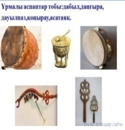 Музыкалық аспаптармен танысады. Аттарын атайды. Өлеңді мұғалімнің көмегімен үйрену. Топпен жұмыс; тапсырманы бірге орындайды |