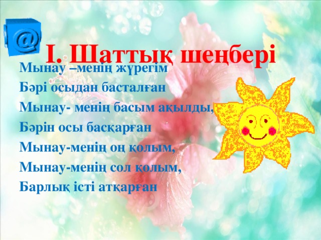 II.Шаттық шеңберін құру;Өлеңді хормен жақсылап айту. Бір бірімен жақсы тілектер айту. |