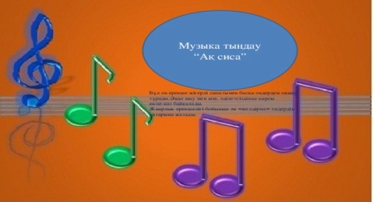 Музыканың отансүйгіштікке баули алатын мүмкіндіктерін біледі.Музыканың көркем бейнесін,мазмұнын мүмкіндігінше ажыратып, жалпы түсінігін айтады. Өз жұмысын жалпы таныстырад |