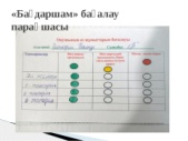 Оқушылар бір бірін бағалайды Платформа жүйесінің пайыздық есептеу нәтижесі Бір бірін «Басбармақ» әдісімен бағалады. Платформа жүйесінің пайыздық есептеу нәтижесі Әр бір жасалынған жұмысты 10 балл мен бағланады. |