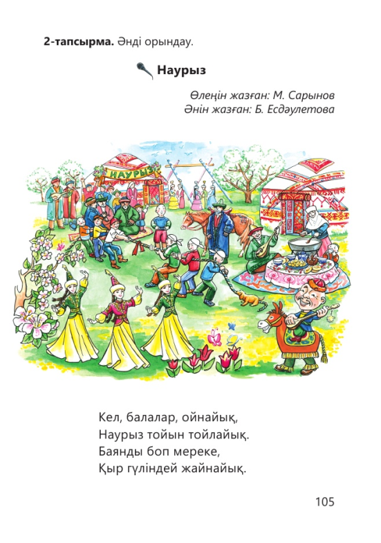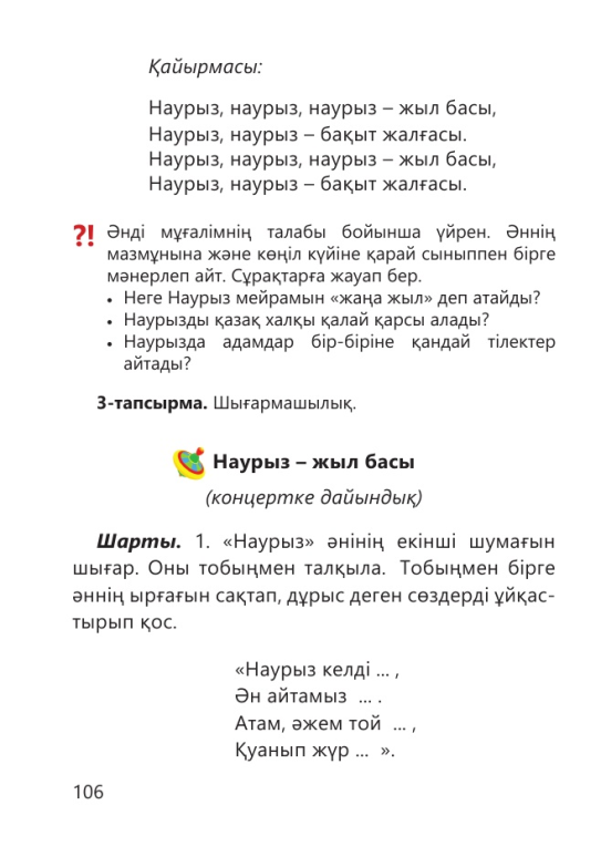 Әннің мазмұнына және көңіл күйіне қарай сыныппен бірге мәнерлеп айт. Сұрақтарға жауап бер. Неге Наурыз мейрамын «жаңа жыл» деп атайды. Наурызды қазақ халқы қалай өарсы алады? Наурызда адамдар бір – біріне қандай тілектер айтады?