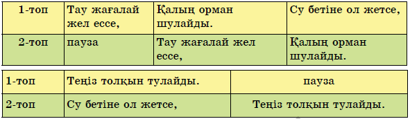 4-тапсырма. Ән үйрену және орындау. «Жел» (өлеңін жазған: Н. Әлімқұлов, әнін жазған: М. Маңғытаев) әнімен жұмысты жалғастыр, үшінші шумағын үйрен. • Әнді мәнерлеп орындауға тырыс. • Осы әннің бірінші шумағын «канон» түрінде айтып көр. Мына кестеге қарап, сыныбыңмен бірге орында