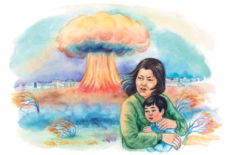 2-тапсырма. Әнді орындау. «Ядролық жарылысқа – «Жоқ» дейміз!» (өлеңін жазған: Р. Наурызбаева, әнін жазған: Н. Мирманов) әнімен жұмысты жалғастыр: • екінші және үшінші шумақтарымен жұмыс жаса; • әнді толығымен орында; • топқа бөлініп, «Әнді көркем орындау» жарысын өткіз. 3-тапсырма. Музыка тыңдау және талдау. Жұбанова Ғазиза Ахметқызы (1927–1993) – композитор. Алматы қаласында музыканттар отбасында дүниеге келген. Ол қазақ әндері мен күйлерін, музыканың әсем әуенін жастайынан құлағына сіңіріп, түсініп өсті. Ғазизаның әкесі Құрманғазы атындағы Қазақ мемлекеттік академиялық халық аспаптар оркестрінің дирижёрі, атақты композитор Ахмет Қуанұлы Жұбанов еді. Ғ. Жұбанова – көптеген көлемді музыкалық опералардың, балет, оратория, ән, хорлардың т.б. шығармалардың авторы. Ғ. Жұбанованың «Хиросима» балеті Қазақстан музыка өнеріндегі үлкен жаңалық болды. Шығарма – музыка тілінің барша жұртқа түсінікті бола алатынының дәлелі. Осы балет үшін Ғ. Жұбановаға 1970 жылы Қазақстанның Мемлекеттік сыйлығы берілді. • АҚШ Жапонияның екі қаласы – Нагасаки мен Хиросимаға атом бомбасын қай жылы тастады? • Жапондықтар атом жарылысы болған осынау қасіретті күнді еске ала ма? • Хиросима мен Нагасаки қалаларында бомбаның зардабын шеккендерге ескерткіш бар ма? • Бұл күні жапон балалары қағаздан қандай құс жасайды? Оның мәні не? Сакура (Шие) (жапонның халық әні) Қазақ тіліне аударған: А. Жәкеева