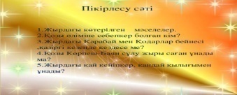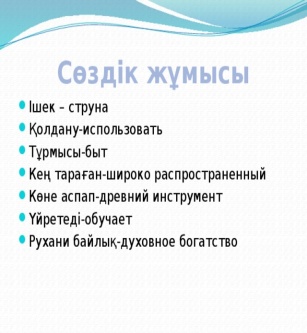 Айтылым Жағдаят. Жұптасып, досымен сұхбат құрады. «Киелі домбыра» туралы айтады. Берілген тәсіл арқылы сұрақтар қояды. Жауап береді.