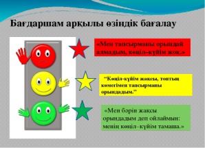 Мұғалім оқушылардың сабаққа қатысқан белсенілігіне қарай 1-10 баллдық жүйе бойынша әр оқушының өзіне тиісті баллын қойып бағалайды. СОнымен қатар, оқушыларды ынталандыру үшін «Қошеметтеу» әдісі арқылы бағалайды. |
