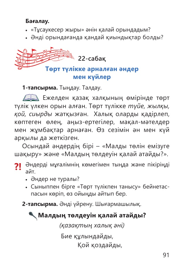 Әндері мұғалімнің көмегімен тыңда және пікіріңді айт. Әндер не туралы Сыныппен бірге «Төрт түлікпен танысу» бейнетаспасын көріп, өз ойыңды айтып бер. 2- Тапсырма. Әнді үйрену. Шығармашылық..