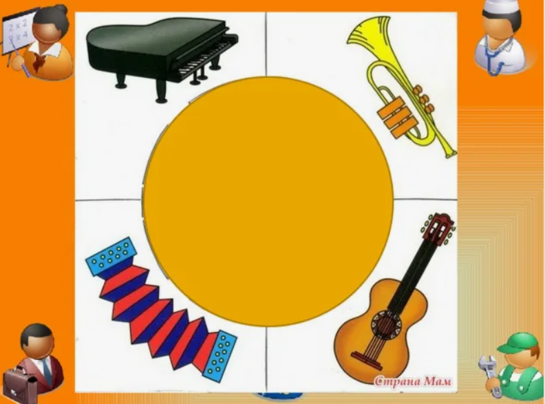 Бірінші сынып оқушылары музыка мұражайына экскурсияға келді. Олар залдарды аралап, музыкалық аспаптарды қарастырды. Экскурсовод әр залда белгілі бір топтағы муызкалық аспап-құралдары бар екенін айтты. Бірақ залдардың бірінде балалар мұражай қызметкерлері құралдарды орналастыруда қателік жібергенін байқады. Оны түзетуге көмектесіңіз.