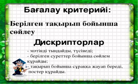 Бағалау. Берілген тапсырма бойынша сөйлеу. Дискриптор. Тақырып бойынша сұраққа жауап береді, постер құрайды.