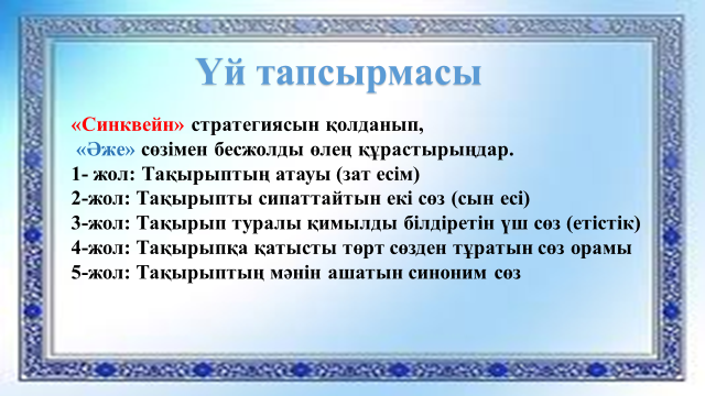 Үй тапсырмасы «Синквейн» стратегиясын қолданып, «Әже» сөзімен бесжолды өлең құрастырыңдар. 1- жол: Тақырыптың атауы (зат есім) 2-жол: Тақырыпты сипаттайтын екі сөз (сын есі) 3-жол: Тақырып туралы қимылды білдіретін үш сөз (етістік) 4-жол: Тақырыпқа қатысты төрт сөзден тұратын сөз орамы 5-жол: Тақырыптың мәнін ашатын синоним сөз