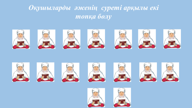 І. Ұйымдастыру кезеңі. Жағымды психологиялық ахуал қалыптастыру: «шеңбер құру» әдісі арқылы. Сын есімдер арқылы «Нағыз әже» қасиеттерін айту арқылы бір-біріне ыстық лебіздерін білдіреді. Үй тапсырмасы «Wordwall» платформасымен «Орнын тап» әдісі. Мәтінді оқи отырып, екі әженің келбетін білдіретін тіркестерді жазып шығады, бірін-бірі толықтырады, кейін берілген үзіндімен жұмыс жасайды, сөздерді орнына қойып жазып шығады. Мақсатым- қыздарыма өз ..... сияқты нағыз қазақи кейіптегі .... көрсету еді. Ондағы ойым- әже деген жарықтықтың анау-мынау қарапайым адам емес, былайғы жұрттан өзгеше, .... да ..... жан екенін сәбилер шын көңілімен сезінсін, оларды не үшін .... керегін түсінсін деген ниет. Сол түні өз .... түсіме кіріпті. Осыдан отыз жыл бұрынғы қалпы, басында ..... бар екен деймін. Ескі .... ыңылдап ән айтып, ..... иіріп отыр. Мен болсам әжемнің бүйіріне басымды тығып, еш алаңсыз .... жеп жатыр екем. Қажетті сөздер: (әжем, ұршық, құрметтеу,аппақ кимешегі, мақаммен, кейуананы, ардақты, ірімшік, қасиетті) Сабақтың тақырыбы мен мақсаты айқындалады. Оқушыларды әженің суреті арқылы екі топқа бөлу |