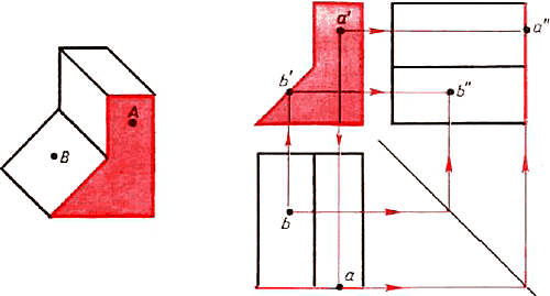 Построение проекций точки В, изданной горизонтальной проекцией b, также показано линиями связи со стрелками.