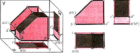 Предмет так расположен относительно плоскостей проекций, что на одном проецирующем луче оказалось по две вершины, поэтому их проекции слились в одну точку. Так, вершины А и В лежат на одном луче, перпендикулярном горизонтальной плоскости проекций H. Их горизонтальные проекции а и b совпали. Вершины А и С лежат на одном луче, проецирующем эти точки на фронтальную плоскость проекций. Их фронтальные проекции а' и с' также совпали. На профильной плоскости проекций W в одну точку (b" и d") спроецировались вершины В и D.
