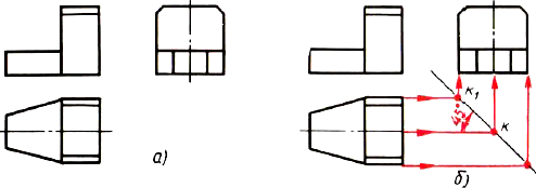 Если осей симметрии на чертеже нет, то продолжают до пересечения в точке k1горизонтальную и профильную проекции граней, проецирующихся в виде отрезков прямых. Через точку k1 проводят постоянную прямую.