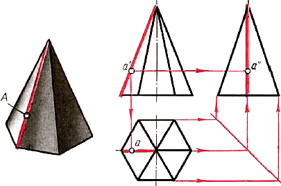 На рисунке 93 проекции грани, содержащие проекции точки А, выделены цветом. Точка A задана фронтальной проекцией а'. Горизонтальная проекция а этой точки должна лежать на горизонтальной проекции грани. Для ее нахождения проводят вертикальную линию связи из точки а'.