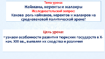 Подводят итог урока и определяет роль найманов, кереитов и жалаиров на средневековой политической арене. 4 предложения ОТВЕТ В начале XIII в. под давлением монголов кереиты и найманы переселились в Семиречье и Восточный Казахстан, где оказали заметное влияние на культурное и этническое развитие населения Казахстана. |