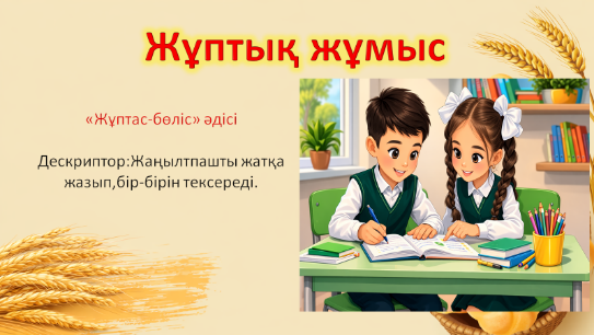 Жаңылтпашты жаттайды,жатқа жазады.Жұбының жұмысын тексереді.