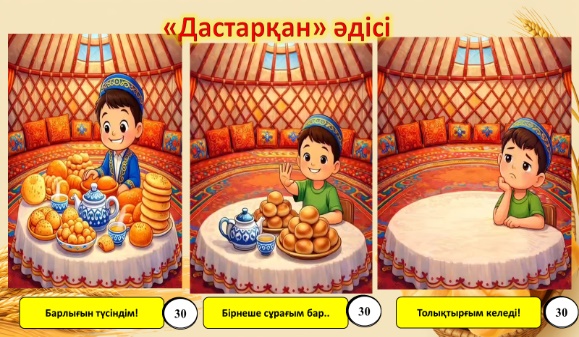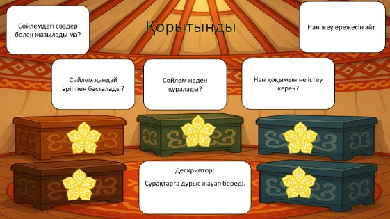 Дескриптор: Сөзжұмбақ шешу тәсілдерін біледі Ұннан жасалған тағам түрлерін табады. Ұлттық тағамдарды табады. Тағамдану ережесін құру. Топтық жұмыс жасау