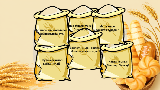 1.Қандай тыныс белгілер білесің? 2.Науан мен әжесі қайда келді? 3.Сөйлем қандай әріппен басталып жазылады? 4.Мәтін неше бөліктен тұрады? 5.Ас атасы нан мәтініндегі кейіпкерлерді ата. 6.Нан туралы мақал білесің бе?