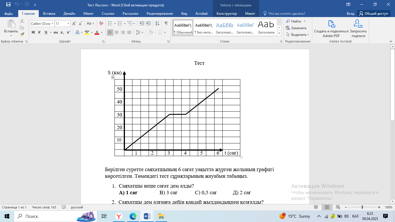 Берілген суретте саяхатшының 6 сағат уақытта жүрген жолының графигі көрсетілген. Төмендегі тест сұрақтарының жауабын табыңыз.