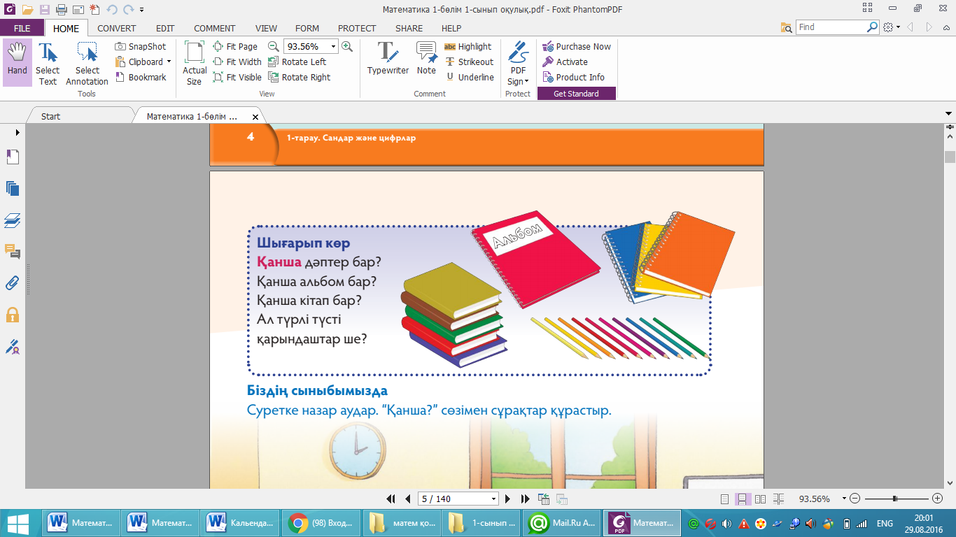 — “Алақай!” деп бес рет айтыңдар т.с.с.Суретке қара, сана. Тапсырманы жалпы сынып-қа орындатыңыз. Оқушылардан әр топтағы заттар санын санауды сұраңыз. Жауабы: екі ит; төрт мысық; жеті гүл; тоғыз шар. Шығарып көр. Берілген тапсырманы жұппен орындатыңыз. Оқушыларға оқу құралдарын санауды ұсыныңыз. Оларға бір-біріне алма-кезек сұрақ қойып, суреттегі заттарды санатыңыз. Жауаптарды жұпта талқылауды қадағалаңыз. Жауабы: дәптер — 3 дана, альбом — 1 дана, кітап — 5 дана, түрлі түсті қарындаш — 10 дана. Біздің сыныбымызда. Оқушыларға төрт адам-нан топтарға бөлініп, өздері сұрақ ойлап тауып және оны топта бір-біріне қоюды ұсыныңыз.