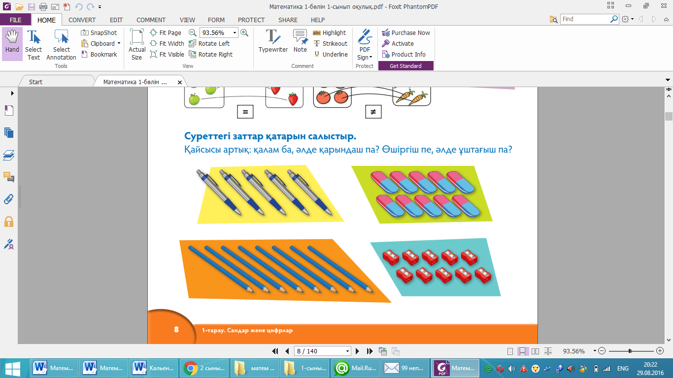Суреттегі заттар қатарын салыстыр. Сынып-пен жалпы жұмыс ұйымдастырыңыз. Оқушылар оқулықтағы иллюстрациялар бойынша топтарды салыстырып, тапсырмадағы қай зат қанша болса, сонша екенін анықтап, сұрақтарға жауап берулері тиіс. Оқушыларға салыстыру нәтижесін тірек сөздер көмегімен айтуды сұраңыз. Әңгіме барысында мына сұрақтарды қоюға болады: — Неше қаламсап? Неше қарындаш? — Егер оларды саны бойынша салыстырса, неше жұп құрастыруға болады? — Неше зат жұпсыз қалады? — Біз қанша қаламсап болса, сонша ұштағыш бар деп айта аламыз ба? Неліктен? — Осы заттардың санын көрсететін сандар тең бе? Берілген иллюстрациядағы басқа заттармен де осындай жұмыс жүргізіңіз. Жауабы: қанша ұштағыш болса, сонша өшіргіш бар. Дәмхана. Берілген тапсырманы топпен орын-дауды ұйымдастырыңыз. Оқушыларға суретке қарап, заттардың санын санауды және салыстыруды сұраңыз. Оқушыларға салыстырудың нәтижесі бойынша қайсысы тең, ал қайсысы тең емес екені туралы қорытынды жасатыңыз. Салыстыру нәти-жесін “=” немесе “≠” белгілерін қолданып, ла-минатталған қағазда жазғызып орындатыңыз. Тапсырманы орындауда қиындық туған жағдайда мынадай сұрақтар қойыңыз: — Суретте қанша үстел салынғанын санаңдар. — Үстел қанша? (қоқыс салатын жәшіктер, ве-лосипедтер, балалар, автомобильдер, тұрақтағы орындар, ағаштар). Оқушылардың назарын заттардың санының сан-мен өрнектелетініне аударыңыз: “Орындықтардың саны үшеу, оны 3 деген санмен жазамыз. Дәмханаға келген адамдар саны — 7. 3 ≠ 7 екенін салыстыруға болады”. Одан әрі оқушылар салыстыруды тапсырма мә-тініндегі сұрақтар бойынша орындайды. Тапсыр-маны орындап болған соң топтар өз жұмыстары-ның презентациясын сынып оқушылары алдында қорғайды. Жауабы: ағаштар саны бұталар санымен тең; орындықтар саны дәмханаға келген адамдар санымен тең.