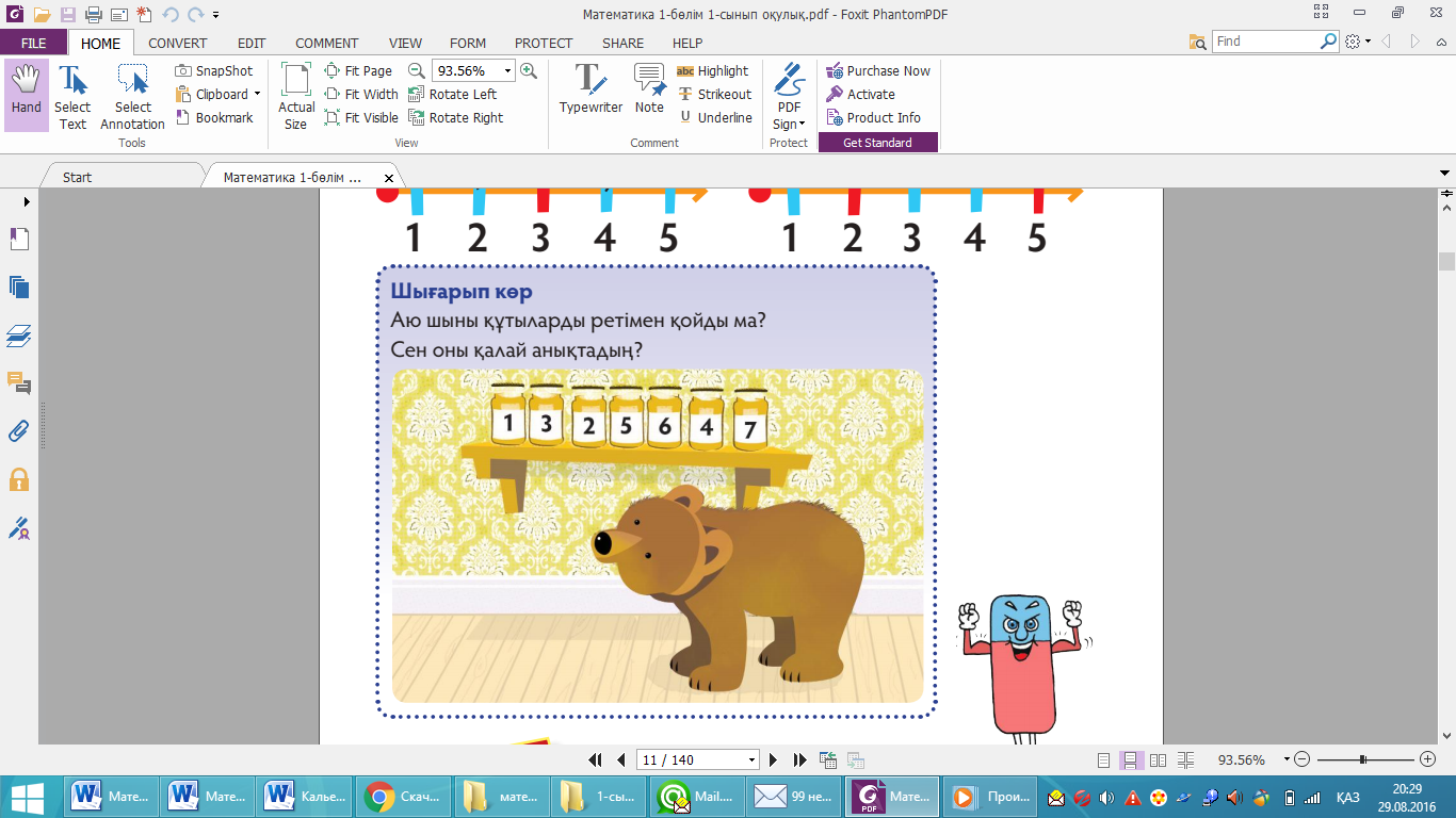 Шығарып көр. Оқушыларға жұппен жұмыс жа-сай отырып, суретке қарауды ұсыныңыз. Оқушылар-дан “Аю бал құмыраларын дұрыс қойған ба?” деп сұраңыз. Оқушылар өз жауаптарын айтулары ке-рек. Талқылау барысында олар құмыралар дұ-рыс емес қойылған деген қорытынды жасайды және біріншіден жетінші құмыраға дейін немесе кері ретпен жетіншіден бірінші құмыраға дейін орналастырулары керек. “Барлық құмыра ретімен тұру үшін қайсыларының орындарын ауыстыру қажет?” деп сұраңыз. Жауабы: дұрыс емес. Орындап көр. Парақшаларды ретімен орна-ластыр. Оқушыларға оқулықтағы доминоның суретін қа-рауды ұсыныңыз. Әр доминода қанша нүкте барын сұраңыз. Балалардан домино тастары топтамасын оқулықта көрсетілген ретпен орналастыруды сұ-раңыз. Қалай орындалғанын жұп болып тексеруді ұсыныңыз. Оқушыларға мынадай сұрақтар қойыңыз: — Бір нүктесі бар тасты табыңдар; — Келесі таста қанша нүкте бар? (Жауап: екі.) Яғни 1-ден кейін 2 болады, 2-ден кейін 3 болады және т.с.с. Оқушылардың назарын барлық сандардың ре-тімен орналасатынына және әр санның өз орны болатынына аударыңыз. 6, 4 және т.б. сандардан соң қандай сандар болатынын айтуды сұраңыз. Көрсетілген саннан кейін тұрған сан “келесі сан” деп аталатынын түсіндіріңіз. 8, 3, 6 сандарының ал-дында қандай сандар орналасу керектігін сұраңыз. Көрсетілген сандардың алдында тұрған сандарды “алдыңғы сан” деп түсіндіріңіз. “Көрші” ойынын ойнатыңыз: қандай да бір санның “көршілерін” атаңыз және оқушылардан оның қай сан екенін табуды сұраңыз. Мысалы, “Бұл сан 5 пен 7 арасында тұр, оның атын ата” немесе “Бұл санның көршілері 3 пен 5”. Сандық сәулеге сүйене отырып, жұмысты орындатыңыз.
