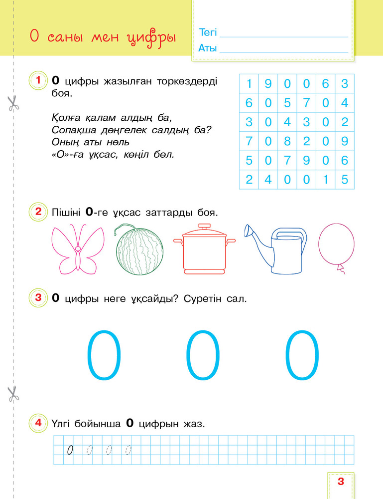 Білім алушы Барлық оқушылары: Сандарды біледі, ажырата алады, тура кері санайды, нөл санының құрылымын біледі. Көптеген оқушылар: натурал сандарды біледі, таниды, тура және кері санайды, салыстырады. Кейбір оқушылар:сандардың қатардағы орнын анықтап, салыстырып, ажыратып, өрнектер құрайды. |