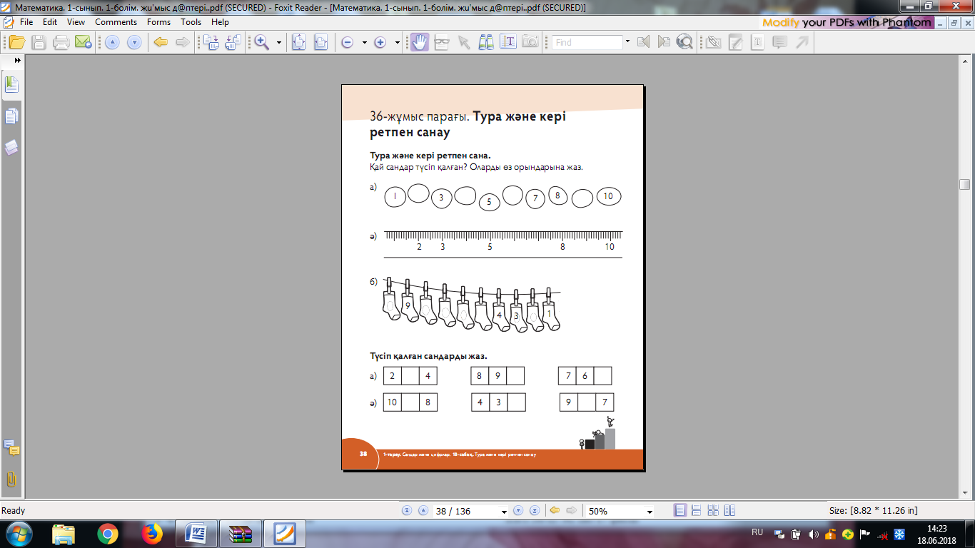 Дескриптор -сандарды 1 сан аттап тура санайды. -2 сан аттап кері санайды. ҚБ өзін өзі бағалау «Білезік» әдісімен бағалау. Сергіту сәті. Оң қолымда бес саусақ, Сол қолымда бес саусақ, Алақанды ашамыз, Бесті беске қосамыз. Кері санайық ал мұны, Неше болды барлығы ? 5 уш тілде Он-девять-ten , бес-пять -five (Ж) Дәптермен жұмыс.(Ойлан ,жұптас) әдісі Бағалау критерийі: Білім алушы -10 көлеміндегі сандарды тура,кері санап ,сандар орынын анықтау. -сызғыш бойына тиісті сандарды табу. -сандарды толықтыру. 1.Тура және кері ретпен санау. Қай сандар түсіп қалған. Оларды өз орындарына жаз. 2.Сызғыш бойына тиісті сандарды жазу 3.Қыстырғыштағы тиісті сандарды толықтыру