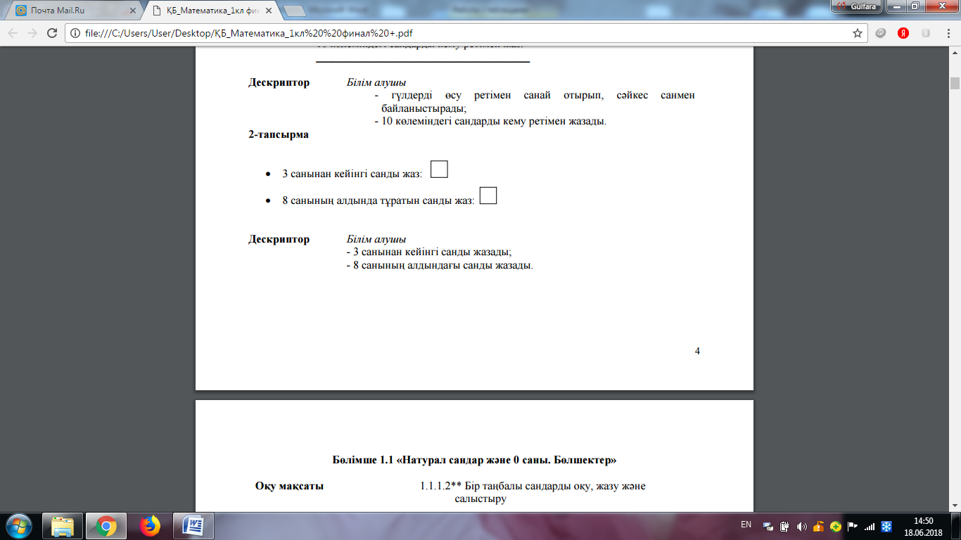 Дескриптор Білім алушы -гүлдерді өсу ретімен санай отырып,сәйкес санмен байланыстырады; -10 көлеміндегі сандарды кему ретімен жаз. 2 тапсырма