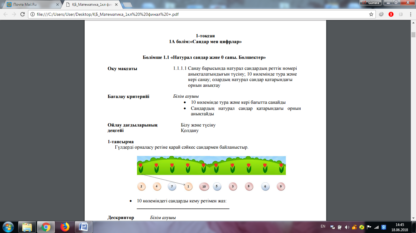 Дескриптор -Тиісті сандарды ұяшықтарға қойып таба алады - Сурет бойынша сандарды салыстыра алады. - Кесте бойынша сандардан өрнек құрастырады. ҚБ. Өзіндік бағалау. «Жұлдызшалар» әдісі Бәрі дұрыс-3жұлдызша Жартылай дұрыс-2 жұлдызша Орташа -1 жұлдызша Сабақты бекіту. Бағалау критерийі: Білім алушы -10 көлемінде тура және кері бағытта санайды. -Сандардың натурал сандар қатарындағы орнын анықтайды. Ойлау дағдыларының деңгейі: Білу және түсіну. Қолдану (Ө) «Үштік » әдісі 1тапсырма Гүлдерді орналасу ретіне қарай сәйкес сандармен байланыстыр -10көлеміндегі сандарды кему ретімен жаз