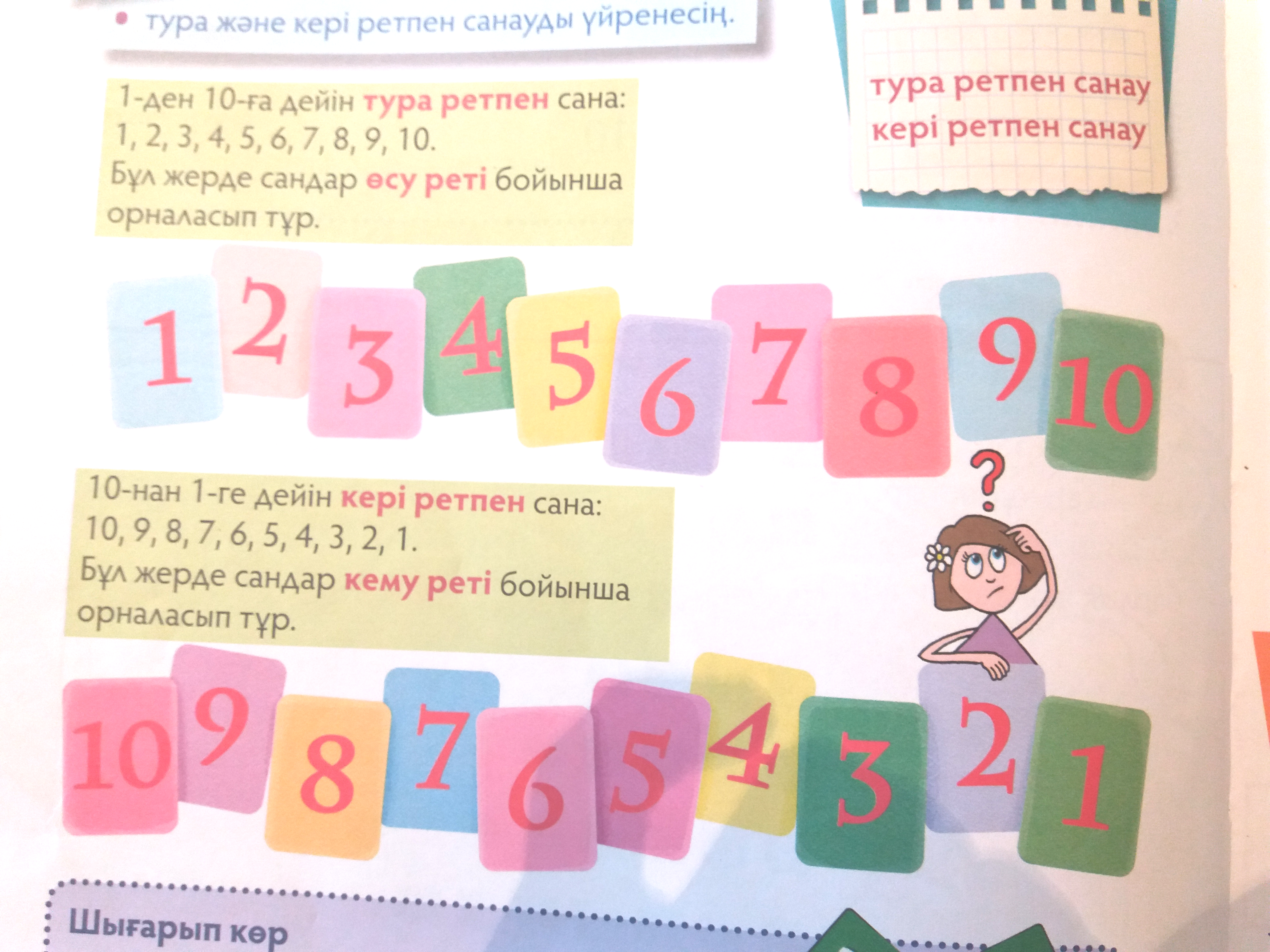 -10 көлемінде тура және кері бағытта санайды -Сандардың натурал сандар қатарындағы орнын анықтайды |
