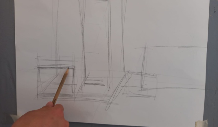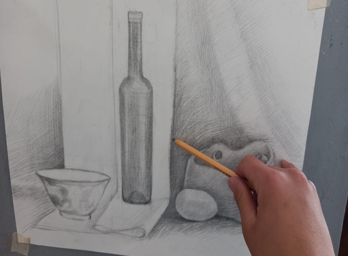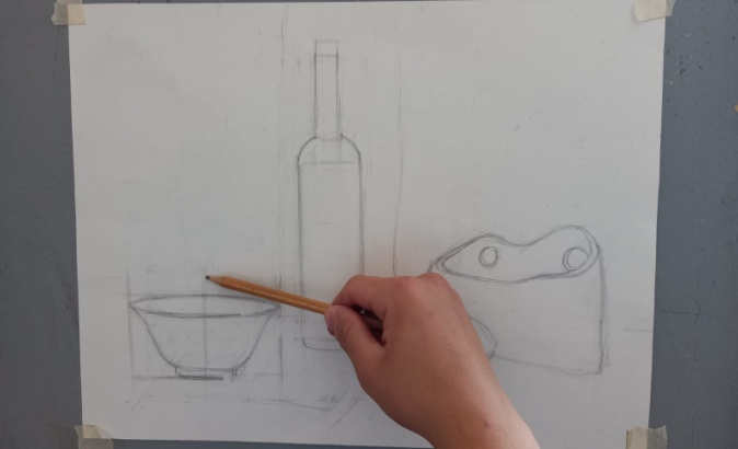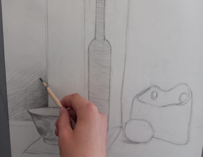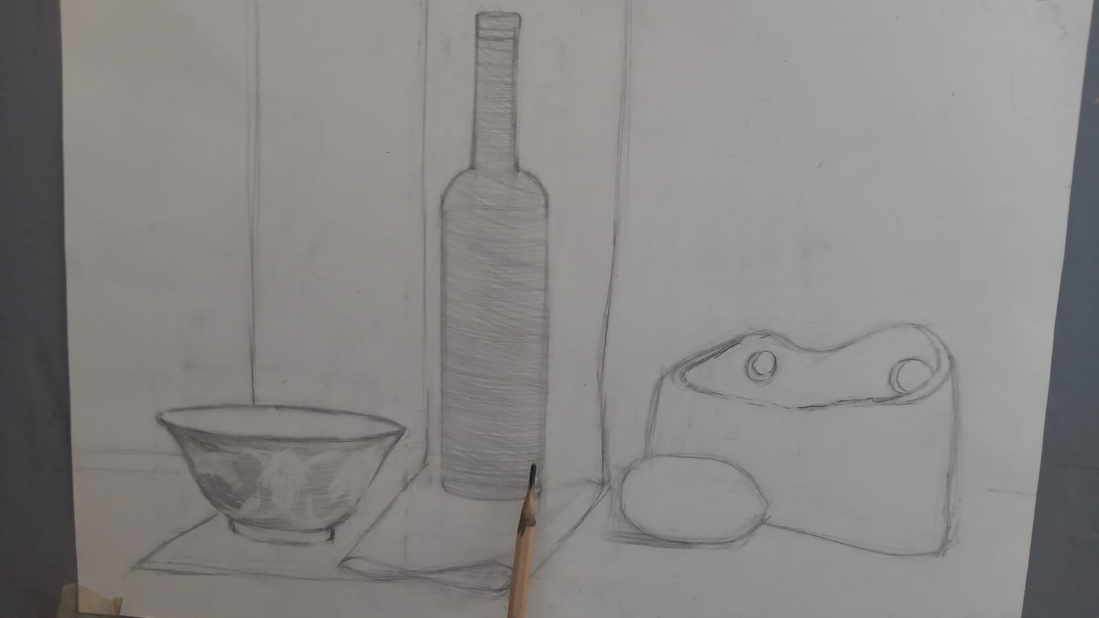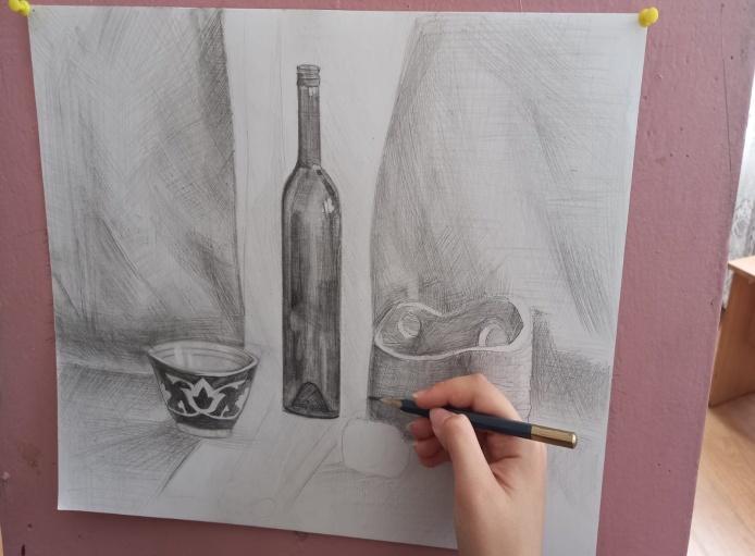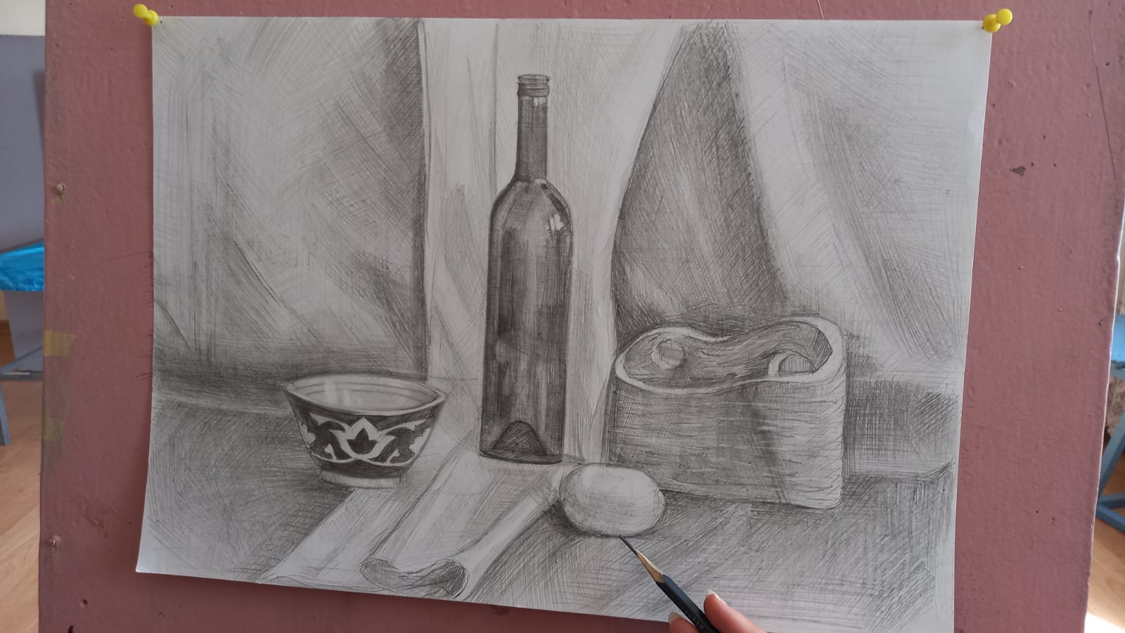 Суретті қағаз бетіне жұмсақ қаламмен жеңіл түсіре отырып, әр заттың пропорциясына тоқталып өтеміз. Қаламмен натюрморттың жалпы нұсқасын салғаннан кейін, артық сызықтарды өшіру керек. Натюрморт сәтті аяқталу үшін, «лессировка» тәсілін қолданамыз. Кезең арқылы жасалған жұмыс натюрморттың жеңілдігін, мөлдірлігін және үйлесімділігіне бағыттайды. «Лессировка» тәсілі жеңіл мөлдір түстің үстіне, басқа мөлдір бір түстің түсуіне негізделген. Осыдан кейін майда бөлшектерге назар аудармай, үлкен көлемде жеңіл түстермен еркін беріледі.