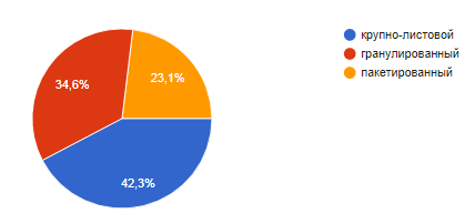 42,3% отдают предпочтение крупно-листовому чаю, 34.6% процентов опрошенных отдали голоса за гранулированный чай (Рисунок 3).