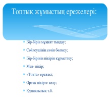 Мұғалім оқуышларға бағыт- бағдар беріп, ынтымақтастықта жұмыс жасауға, ойын анық, дәл, нақты жеткізе білуге баулиды. 8-тапсырма Жеке жұмыс Мұғалім оқушыларға ережені түсіндіреді. Тапсырма Жеке жұмыс |