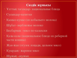 Айтылым Мәтінде аталған бір ұлттық дәстүр туралы білетінін айтып, «Кубизм» тәсілі арқылы сипаттайды. Ойтаразы «Шығу парағын» пайдаланып, сұрақтарға жауап береді.