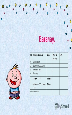 Қалыптастырушы бағалау: Өз ойын дұрыс мағынада білдіріп, талқылауға белсенділікпен қатысқан оқушыға «Жарайсың!» деген мадақтау сөзімен ынталандыру. |